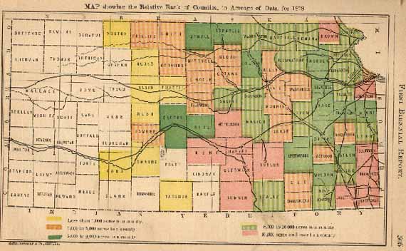 The second belt - those counties having 8,000 to 10,000 acres - skips here, there and everywhere about the State. Linn leads, Pottawatomie next, then Dickinson, Montgomery, Atchison, Jefferson, Marshall, Neosho Douglas, Lyon, Nemaha, Leavenworth, Marion, Washington, Cowley, Doniphan and Saline, in the order they are placed. The aggregate acreage of the twelve reaching 147,068, or within a fraction of one-third of the entire acreage of the State.