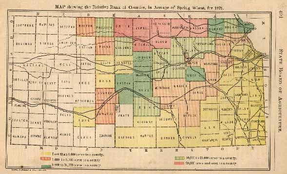 In 1872, the acreage of these seven counties was 30 per cent. of the spring-wheat acreage of the State, in 1878 it was nearly 48 per cent., while the increase in the seven counties was 41 per cent. of the acreage of the State. The second belt embraces counties having over 10,000 and less than 20,000 acres, and almost entirely confined to the west and northwest, Reno being the only county in the southwest. The other nine counties in this belt - Brown, Dickinson, Clay, Ottawa, Phillips, Saline, Osborne, Riley and Pottawatomie - with the single exception of the first named, all lie contiguous to the counties comprising the main spring-wheat belt. The third belt, 5,000 to 10,000 acres, embraces Nemaha, Lincoln, Ellsworth, Morris, Barton and Rice.