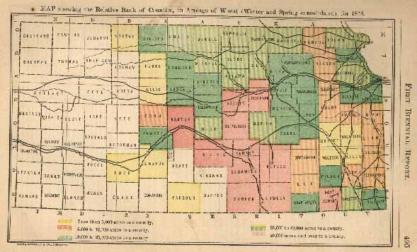 We are indebted to Hon W. G. Le Duc, Commissioner of the National Bureau of Agriculture, Washington, D. C., for many valuable data, from which we ascertain that Kansas ranked twenty-four among the States in 1866; nineteen in 1870, and eleven in 1875. According to the official returns to this department, and the official and estimated product in other States, Kansas ranks first among the wheat-producing States in 1878.