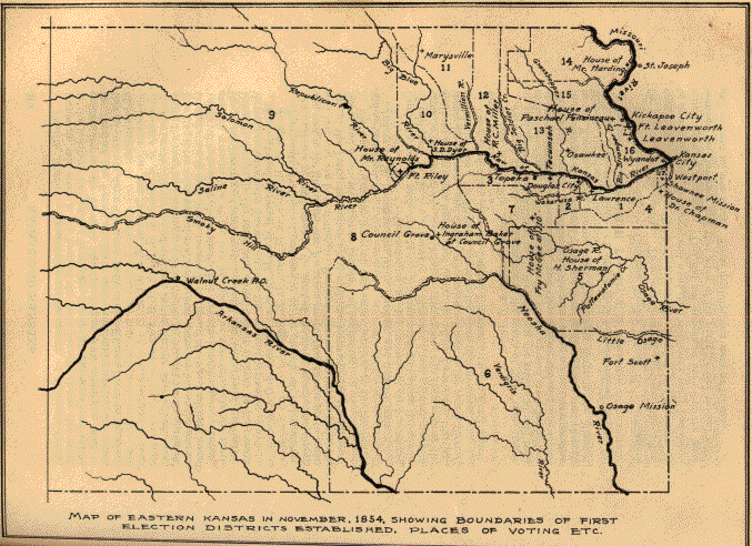 In his tour of the territory, as reviewed above, he visited Fort Riley, Council Grove, Lawrence, and other important settlements of the Territory. He was tendered a reception at Lawrence, and his address on that occasion differed little from what he had said upon the occasion of his reception. His survey of the Territory occupied two weeks, when he returned to Fort Leavenworth. There he occupied himself with the matter of the election of a Delegate to Congress. His proclamation for the election was issued on the 10th day of November, 1854, and the election was set for the 29th of November. In his journey through the country he had selected points where the voters should meet. He divided the Territory into sixteen districts. In the schedule to his proclamation, these districts are described, and the places of election specified as follows: