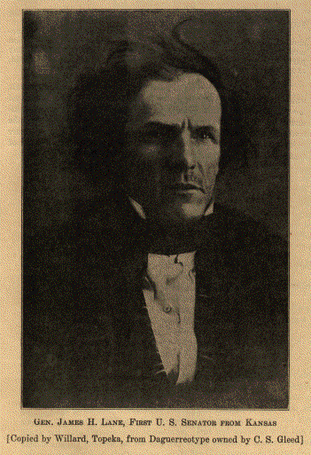 James Henry Lane was born in Kentucky, near Lawrenceburg, Indiana, June 22, 1814. His father was Amos Lane, a noted Indiana politician, and credited with being the first man in Indiana to suggest the name of Andrew Jackson for President of the United States. The Lanes were of the stock called by Prentis, "The from everlasting to everlasting Scotchh-Irish." Amos Lane was of New England ancestry, but as a young man went to New York. At Ogdensburg he met and married Miss Mary Foote. He was born in Connecticut, and was of a distinguished New England family. She was a woman of piety, and was for forty years, a member of the Methodist Episcopal Church. She was possessed of more than an ordinary share of good common sense, and a desire to accomplish something in the world. She was the inspiration of her husband's efforts to enter the practice of law.