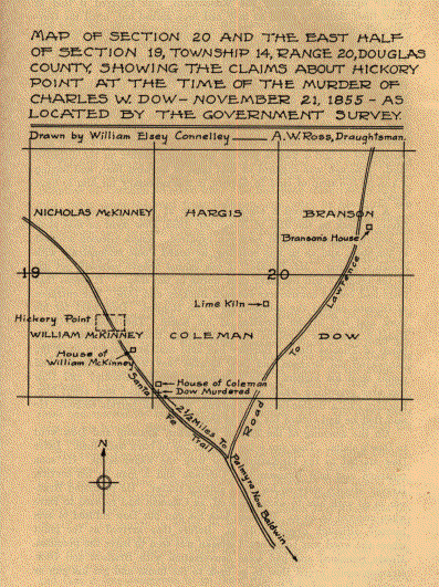 Charles W. Dow came from Ohio to Hickory Point in February, 1855. He selected a claim which was immediately south of that of Jacob Branson, which had formerly belonged to William White, of Westport, Mo. He was unmarried and went to live at the house of Branson, where he made his home until he was murdered. There were a number of Pro-Slavery men living about Branson, among them Franklin M. Coleman, Josiah Hargis, and H. H Buckley, who was from Johnson County, Missouri. Coleman was a Virginian who had moved to Louisa County, Iowa, in 1849. From Iowa he went to Kansas City, Missouri, in April, 1854, where he remained three months, coming then to Kansas Territory in 1854.1 While in Missouri he was the proprietor of the Union Hotel, at Kansas City. He came to Hickory Point in September, 1854. He jumped a claim held by a non-resident named Frasier, and which joined that of William White, and later jumped by Dow. Coleman had questioned Dow about the burning of the cabin on the White claim. They had a quarrel about it and Coleman said, "You deny doing it yourself, but will not say you do not know of its being done, and I think such men as those are dangerous in the country." Dow's claim was immediately east of that of Coleman. There was a conditional line between the claims of Dow and Coleman and this line had been mutually agreed upon and was satisfactory to both parties. When the Shawnee Reserve line was surveyed, the settlers believed it furnished a base from which they might determine very nearly where the lines of their claims would fall when the Government finally made the survey of the land. The Shawnee line was two and a half miles east of the claim of Coleman. Dow and others surveyed their claims using the Shawnee line as a base. This was not satisfactory to some of the squatters, especially the Missourians, who believed it best to allow their claims to stand as they had been staked out, until the Government survey was made. These new lines threw Dow's west line over on the east part of Coleman's claim about two hundred and fifty yards. The claim of Jacob Branson was thrown west the same distance, causing him to encroach on the land claimed by Hargis. Contention arose between Branson, Hargis, Dow and Coleman over this matter. Hargis and Coleman desired the old lines to stand, and they continued to cut timber east of the new lines surveyed from the Shawnee Reserve line. Dow protested to Coleman when he continued to cut timber. Coleman afterwards insisted that Dow was abusive in his interview and threatened to find a way to prevent his cutting timber on the disputed land. Coleman was engaged at that time in burning lime, and having a kiln on the strip of land in dispute, it was necessary for him to have wood.