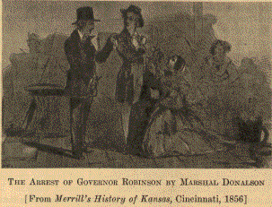 ![]() THE ARREST OF GOVERNOR ROBINSON BY MARSHAL DONALSON [From Merrill's History of Kansas, Cincinnati, 1856] |