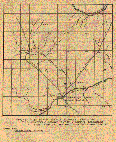 The Pottawatomie Rifles, the Osawatomie Company - Captain Dayton - and the company of Old John Brown must all have camped at that tent with the grindstone the night of Thursday, May 22d. It was on Friday morning, May 23d, that John Brown began to talk of going to Dutch Henry's Crossing. It would have been noon at least, before the Pottawatomies Rifles could have reached the camp from the house of Ottawa Jones. It was probably about that time on the 22d when they did arrive, rather than on the 23d, as Mr. Villard and Mr. Connelley have it. It is impossible that the men could have done the marching in the time allowed by Mr. Villard and Mr. Connelley. The party of Old John Brown would have been compelled to march to the camp on Ottawa Creek, and from that camp to Dutch Henry's Crossing, in twenty-four hours. This is a distance of at least seventy miles. Townsley's horses could not have made that march. Nor could the men.