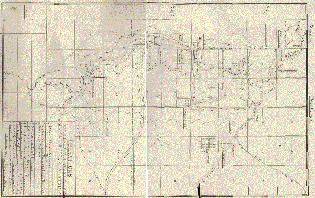 Map of Operations Near Baldwin and Pursuit of Quantrill, August 21, 1865.