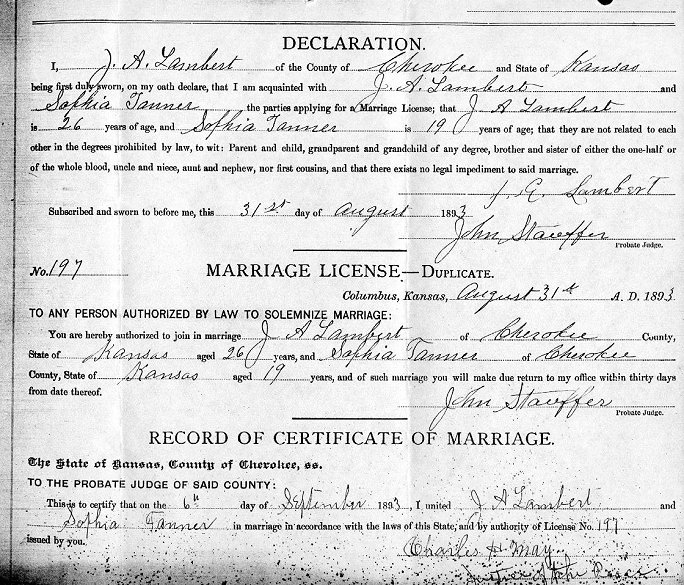 | jatanner.jpg | Marriage License of James A. Lambert and Miss Sophia Tanner, 31 August 1893 | 156k | 10/26/2001 | Marvel Delahaye |