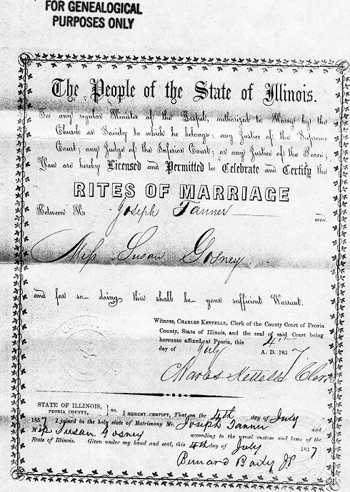 | jotanner.jpg | Marriage License of Joseph Tanner and Miss Susan Gosney, 4 July 1857 | 134k | 10/26/2001 | Marvel Delahaye |