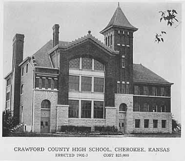 The town of Cherokee was surveyed and laid out by Colonel Percy Daniels, since lieutenant governor of Kansas, and who resides on his farm near the site of Crawfordsville. Among the first settlers of Cherokee were George W. Brown, G. W. B. Hoffman, J. Manlove, Joseph and George Lucas, A. N. Chadsey, Captain Jameson, J. W. Fletcher, Dr. Bailey and J. F. Price, the present editor of the Cherokee Sentinel, Some of these reside at Cherokee yet, honored citizens, who have faithfully enacted their part, in building a thriving commercial and educational town. Others have moved away, while some have joined the great majority, and are peacefully resting from their labors. The county high school, a prosperous educational institution, is located here.