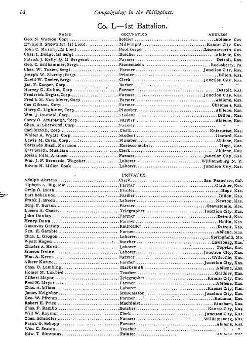 | enlist.jpg | A photocopied list of the members of the 20th Kansas Volunteer Infantry, Co., L, 1st Battalion. | 136k | 06/29/1999 | John Leach |