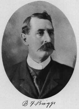 Benjamin Briggs was a native of Vermont and was a cousin of ex-Governor Briggs, of Massachusetts. He was a son of Benjamin Briggs, Sr., a native of Massachusetts, and was one of a family of five children, as follows: Charles, Alanson, Erastus, Cynthia and Benjamin. The father of our subject moved from Vermont to Chicago, Illinois, in 1837, and there followed his trade, that of wagon-maker, until 1848, building the first wagon made in that city. He moved from there to Orland, Cook county, Illinois, where he was located until 1852, when he bought a farm in Homer township, four miles east of Lockport. He accumulated a large estate, which was divided among his family and his widow after his demise. He died of smallpox at his home in 1863. His first marriage occurred at Chicago, where his wife died in 1842, leaving two children, William and Cynthia. William served in the 100th Reg., Ill. Vol. Inf., during the Civil war, and is now a farmer of Orland, Cook county, Illinois. He married Belle McGregor, and has three children: Alexander F., Ella and Ernest, one other, Benjamin, Jr., dying in infancy. Cynthia became the wife of John Panter, and both are now deceased; they had nine children most of whom reside in California. Benjamin Briggs formed a second marital union in 1844, with Fidelia S. Fry, a native of Andover, Massachusetts, who is now living at Idenbro, Kansas, at the age of eighty-three years. Her father moved to New Hampshire and purchased the site of what is now the town of Concord. Five children blessed this union, namely: Frank, Mary (Griswold), Augustine, Benjamin F. and Eugene. Frank, a successful farmer of Kansas, married Lillie Lefever, and has three children, Frank, Mary and Lyda. Mary married Guy Griswold, who was born in Lockport, Illinois, and became a wealthy grain buyer of Henry, Illinois, - he died in 1895, and his widow resides in Englewood, Chicago, and has four children: Grace, proprietor of a ladies' furnishing store at Parsons, Kansas; Emerette, wife of Mr. Gousche, a grain dealer of Bellflower, Illinois, and by whom she has a son, Arthur; Ora, whose husband is manager of a large packing industry in Boston, Massachusetts; and Percy, a grain dealer of Idenbro, Kansas; Augustine came to Kansas with our subject, and is a wealthy land owner of Labette county, residing at Idenbro with his mother. Eugene died in infancy.