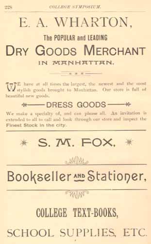 Transcribed from College Symposium of the Kansas State Agricultural College Topeka, Kansas: The Hall & O'Donald Litho Co. 1891.