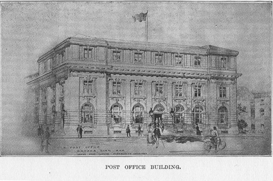 It was under the administration of President McKinley that the appropriation of $250,000 was made and the present post office building at Seventh street and Minnesota avenue was erected, in 1900. In 1909, the post office building having become too small for the increasing postal business of the city, another appropriation of $150,000 was obtained and in the fall of 1910 the contract was let for an addition on the south and for raising the height to three stories. While this was being done a three story building on the north side of Minnesota avenue between Seventh and Eighth streets was used for the post office and the United States court.