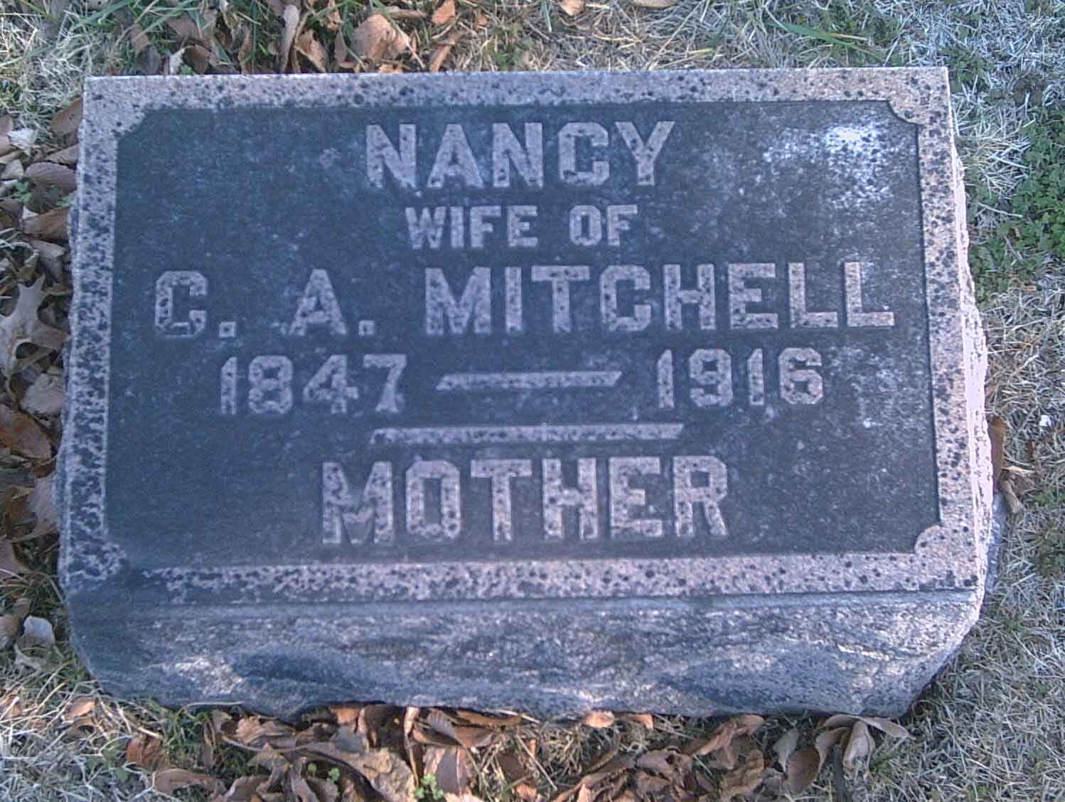 Nancy Mitchell, your mother, was born in Perry County, Ohio, Sept. 29th, 1847. Died at Cherryvale, Kan. Dec. 20th, 1916.  Grave in Fairview Cemetery, Cherryvale, where I expect to be laid beside her.