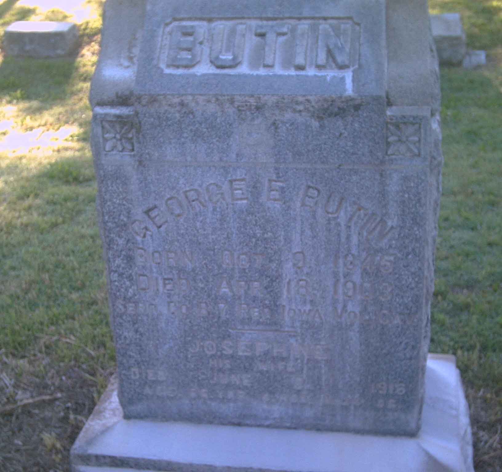 May 12, 1875, Mr. Butin was married to Miss Josephine Hull at Chillicothe, Iowa, and she, with three sons and three daughters, survives him.  In his death the bereaved family have lost a husband and father whose devotion, love and kindness for and interest in their welfare never relaxed.  The city has lost one of its earliest settlers and an upright business man; a citizen whose fidelity to law and justice, to the town’s best interests, to the rights and well-being of neighbors and friends, have been steadfast, every day and with every breath, as he has consistently and practically exemplified in thirty-one years of active, open, honest, sincere and virtuous life before and in contact with all men in this community.  Frank, straightforward, incapable of dishonesty, deceit or dissembling, G. E. Butin’s honored name for integrity, truth and principle was such that his immediate family and relatives should cherish it as a priceless legacy and realize from consolation in the hour of their sorrow.