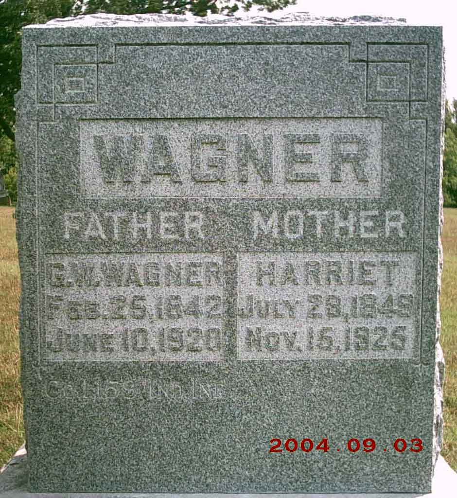 George W. Wagner was born in Union county, Indiana, February 25th, 1842.  At the age of 16 he moved with his parents to Noblesville, Hamilton county, Indiana.  It was there that he was united in marriage to Miss Harriet George, March 27th 1872. Four children were born to them.  Three of these with the widow survive him.  They are:  Eliza, wife of J. E. Mull, of Topeka, Kansas; Fred A. Wagner, of Topeka, Kansas; and Bess, wife of Fred Moore of Eastland, Texas.  All were present at the time of the father’s death.  James M. the second born of the children died in infancy.