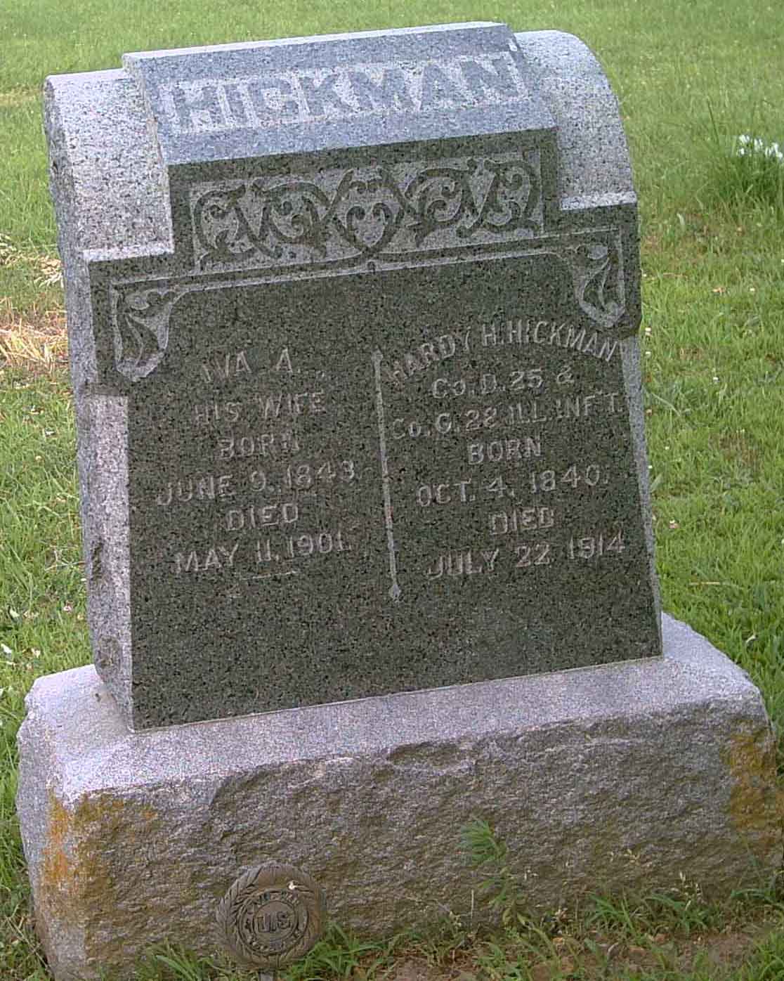 Hardy H. Hickman, eldest son of Hiram and Martha Hickman, was born near Georgetown, Ill., October 4, 1840, where he made his home until 1861 when he enlisted in Company D, 25th Illinois Infantry, in which he served the Union three years. He then re-enlisted in Company G, 28th Illinois, serving one year. He was united in marriage with Iva A. Sinder, Jan. 1, 1866. To their union was born two daughters and three sons, all of whom survive their father. Mr. Hickman came to Kansas in 1868, settling on the farm which he owned at the time of his death. In 1879 he became a Christian and united with the Presbyterian church which then had an organization at Fairview. Later the organization at Fairview was disbanded and he united with the M. E. church in 1897 under the pastorate of Rev. J. E. Whitehead, and was a faithful member of that church until his death.