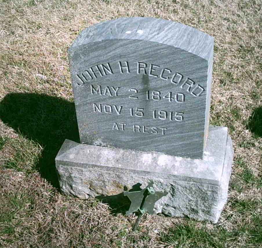 John H. Record was born in Dorchester county, Maryland, May 2, 1840. He died after an illness of two months at his home in Thayer, Kansas, November 15, 1915, at the age of 75 years, 6 months, and 13 days. When quite young he united with the Christian church and has since been a faithful member. At the age of 21 he entered in Company A, 1st Regiment, Eastern Shore, Maryland, and was a faithful worker in the cause of the Union.
