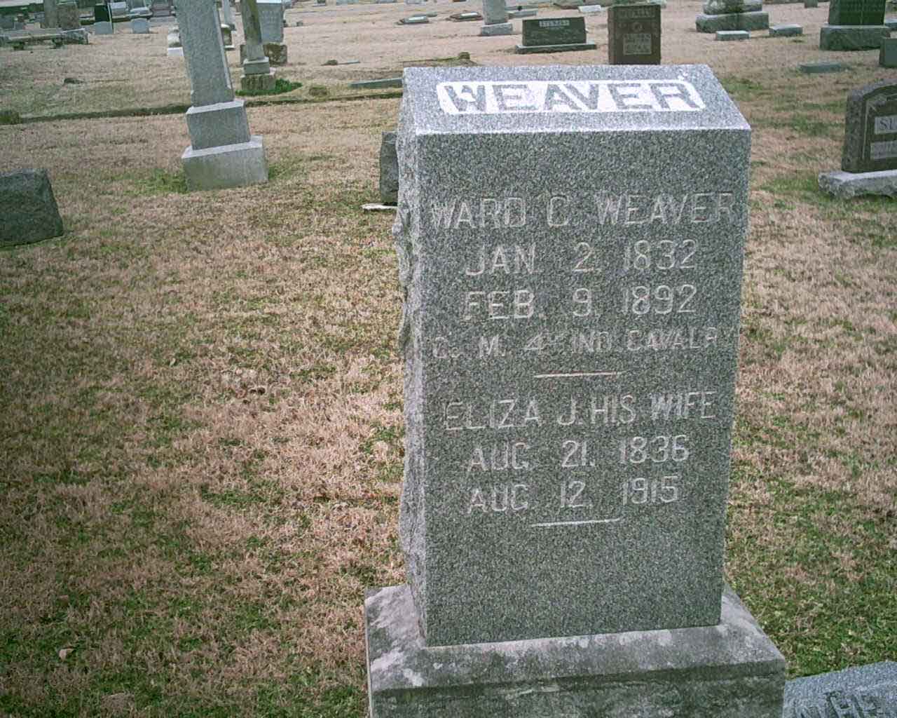 Ward C. Weaver was born in Ohio Jan. 2, 1832 and died in Montgomery county, Kansas, Feb. 9, 1892. Cause of his death, pneumonia. On Feb. 20, 1854, in Vigo county, Indiana, he married Miss Eliza Jane Hunt, who survives him. Most of his life up to 1880 was spent in Indiana. In that year he removed to the farm on which he died. In August, 1862, he enlisted in Co. M, 4th Indiana Cavalry, and served till the end of the war. His living children are: Mrs. Belle Noyes, in Indiana, Eli R. Weaver of Selkirk, Kansas, William Weaver of Tacoma, Washington, Mrs. Clara Gray, of Chautauqua county, Mrs. Alice Trueblood, Lay, Mrs. Ella Chamberlain, Chautauqua county, Simeon L., and Edgar A. Weaver, at home.